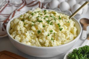 - Dice potatoes and eggs but reserve 4 egg yolks for the dressing