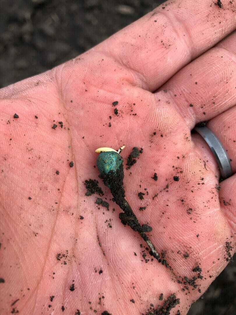 These photos show Latham LH 5245 VT2 PRO planted May 5 at 36,000 population. We’ve only had a few days of sunshine to get this crop started, so I’m happy to see good emergence and the start of a nice stand.