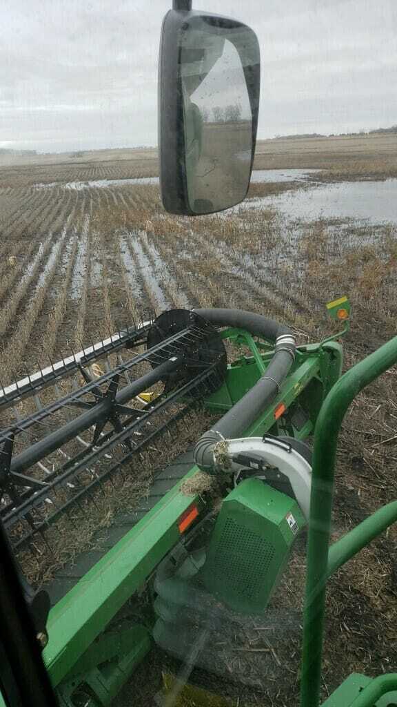 Much cooler temps this week is allowing the flex head to slide over the ice. so the combine head is not scooping up water anymore. Many soybean acres were harvested this week, so corn harvest will soon begin.