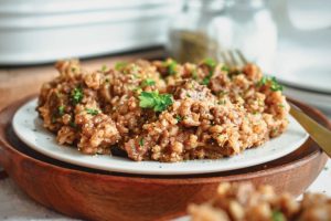 Combine all ingredients in glass 9” x 13” pan and bake for 1 hour at 325 degrees. It is best to stir once or twice during baking so that all rice gets absorbed by the liquid.