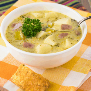 - Add potatoes, water/stock, ham, celery, and onion to stockpot. Bring to a boil, and simmer until potatoes are tender.