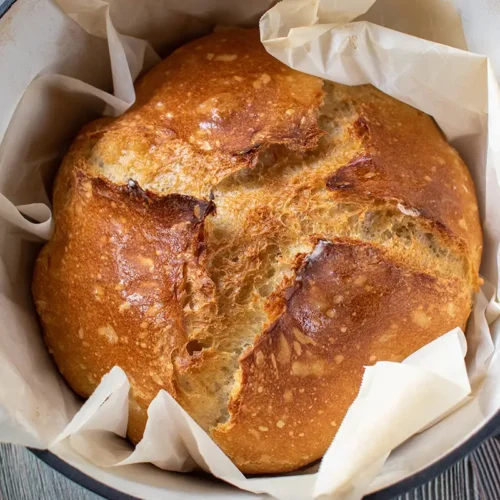 - Serve. Remove from the oven, uncover and then carefully lift the edges of the parchment to transfer the bread to a wire cooling rack. Cool for at least 30 minutes, then slice.