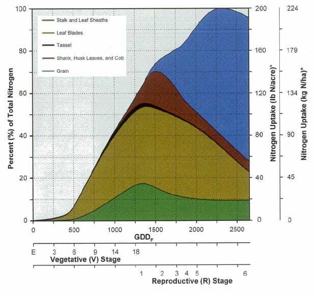 60% of the nitrogen needed to support corn growth is built-up between V4 and pollination, making this an important time to monitor for deficiency. Scouting for nitrogen deficiency should also take place after episodes of heavy rainfall.