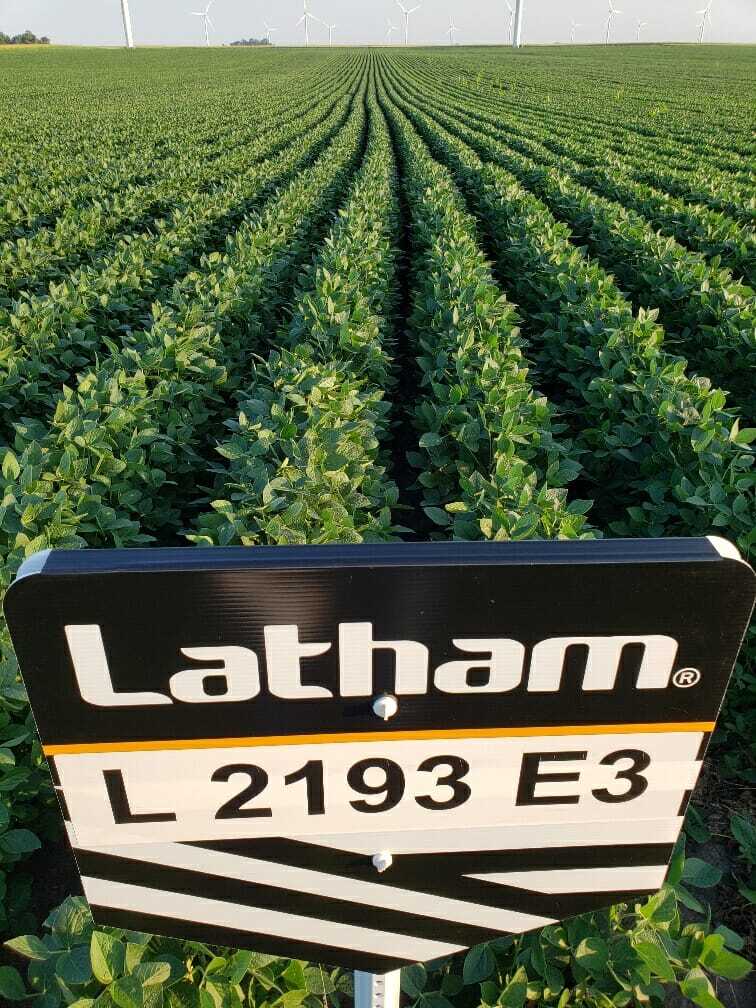 This field of Latham’s 2193 E3 Enlist soybeans was planted May 5 near Garner, Iowa. This week they were harvested, yielding in the mid-60 bushels per acre.