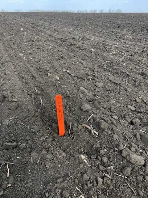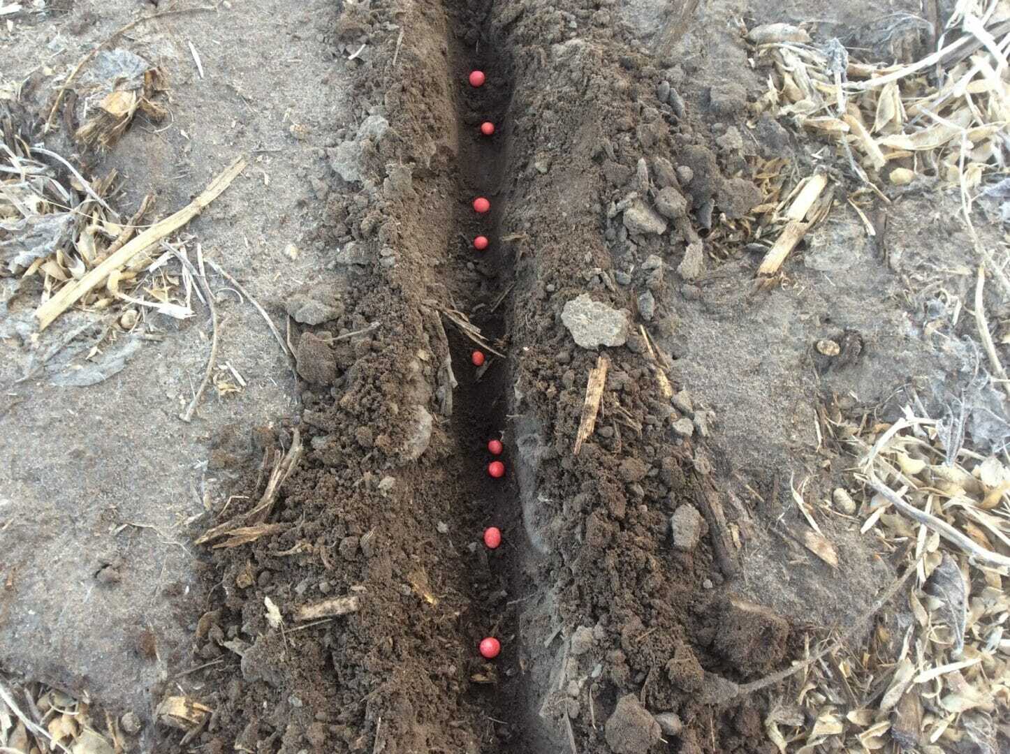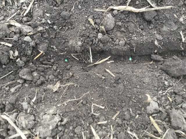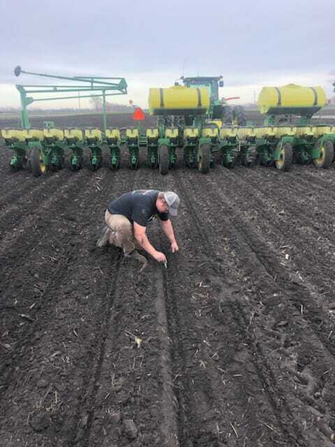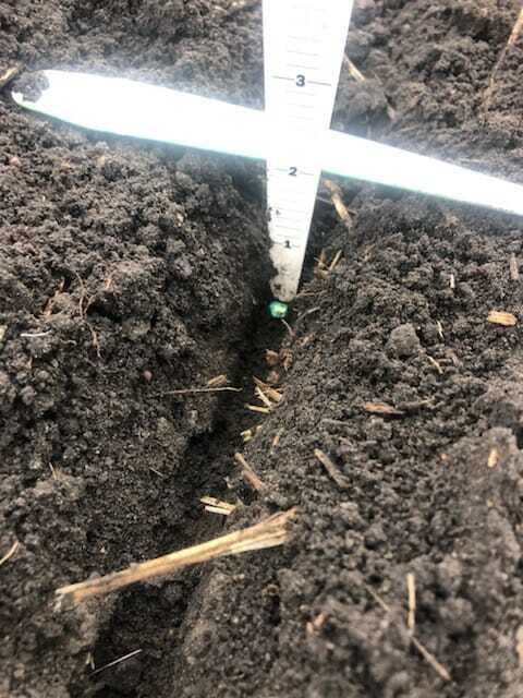 The main objective at planting time is to provide seed with an environment that promotes rapid germination and vigorous early growth. Optimal planting depth for corn in 2 inches deep and 1.5 inches for soybeans. Latham Dealer is checking seed depth in a field of LH 3937 VT2 PRO RIB.