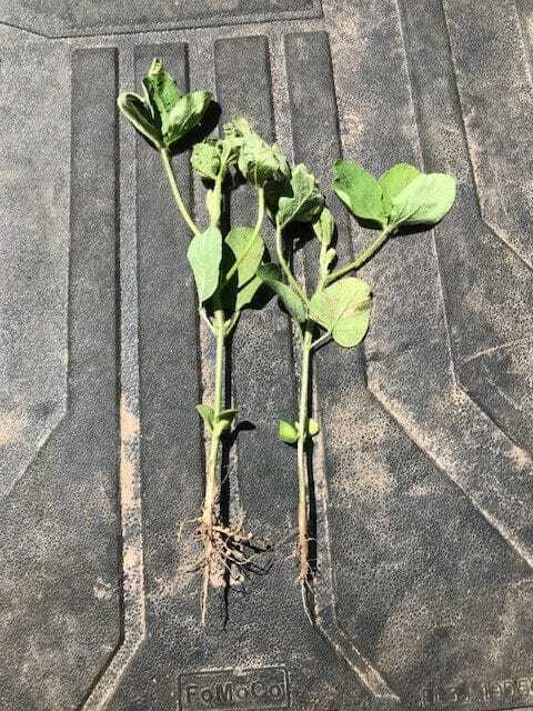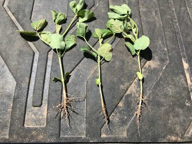 These photos show the importance of seed treatment. Untreated L 1438 R2 was planted as the outside 12 rows of the plot. Treated L 1438 R2 was planted as one of the strips. In the first picture, the four plants on the left were treated with Latham® Soyshield Plus™, which is a premium formulation that gives superior control of most seed and soil-borne diseases, as well as includes a systemic insecticide. The four plants on the right were untreated. You can see the treated plants are taller with bigger root mass and more nodules. This is also shown in the second photo.