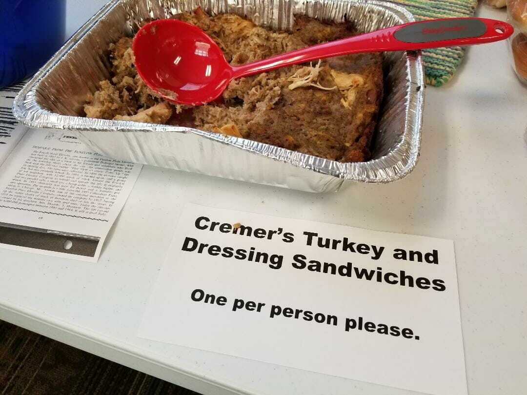 Just a sidenote: When I shared my Culinary History of Iowa program at the Carnegie-Stout Library in Dubuque in September 2017, the library also hosted a potluck featuring Dubuque foods. The mere fact that the librarians felt the need to post the sign “Cremer’s Turkey and Dressing Sandwiches: One per person please” says a lot about how popular these sandwiches are.