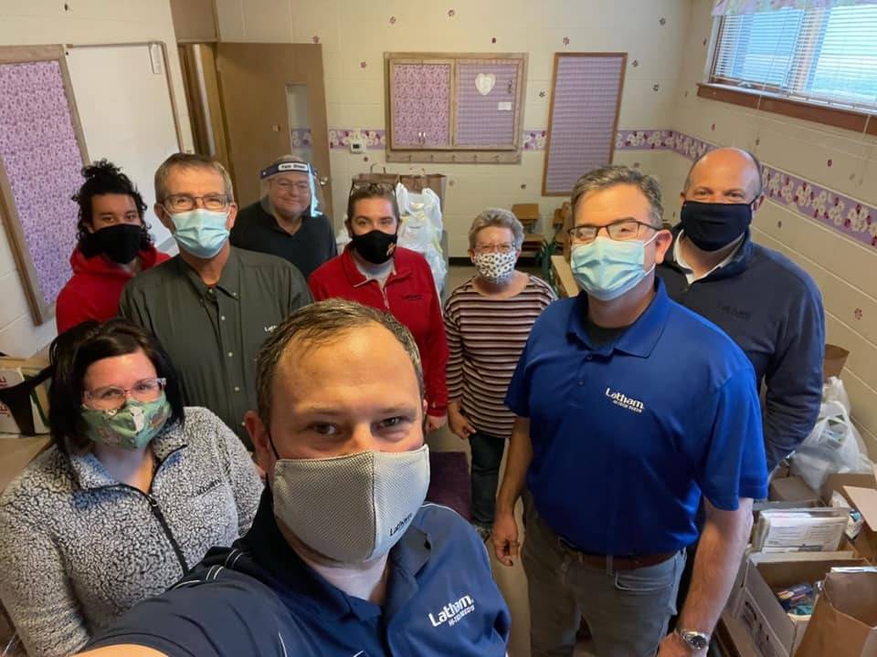 Special thanks to the Team Latham members who volunteered time on Ag Day to help pack food sacks at the West Fork Food Pantry in Sheffield, Iowa. The number of families served by the food pantry has doubled since the pandemic began. Pictured from front to back and from left to right are: Ryan Schon, Brandi Hoesing, John Latham, Rod Fesenmeyer, Jesse Meints (youth and family director for Zion St. John), Pastor G. Kim, Meg Schon, Diane Wills (site coordinator for West Fork Food Pantry), and Chris Latham.