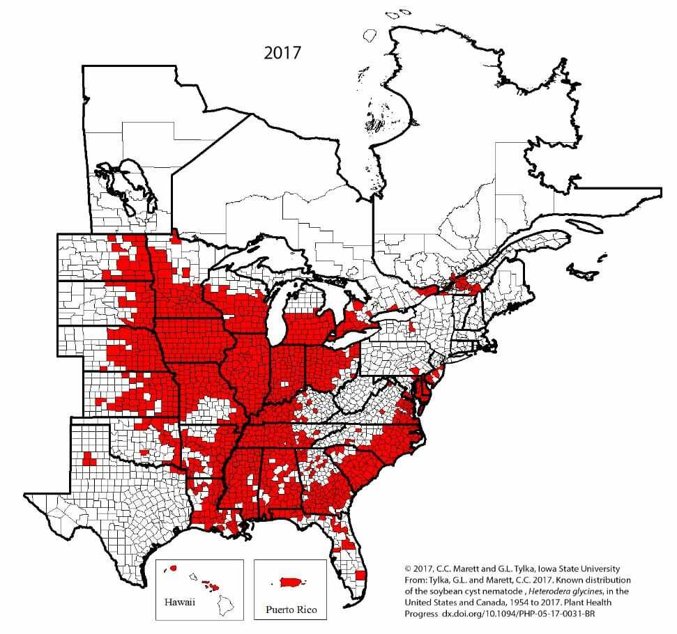One of the biggest challenges when identifying SCN is that it is not accompanied with many symptoms, but can cause up to a 30% yield loss. Usually SCN shows up in hot spots, where you can see severe stunting, yellowing, shorter crop, lack of canopy or early maturity. These symptoms tend to show up on lighter soil or during tough growing seasons. Wherever soybeans are grown, typically SCN is an issue. Below are two maps to show the growth of SCN over the years.